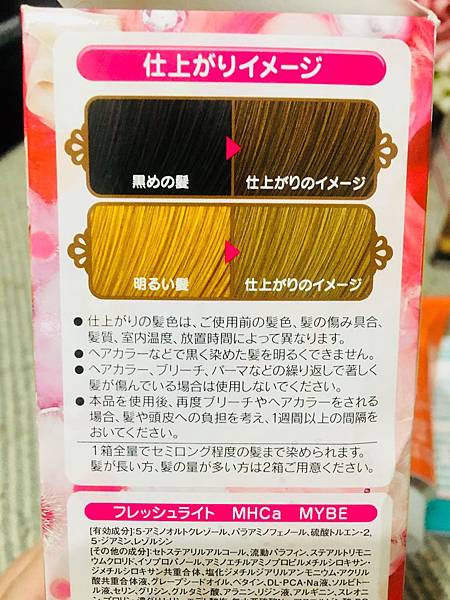 盒內有 日文及中文使用說明書、染劑第一劑&第二劑、梳型瓶蓋、護髮霜、塑膠手套